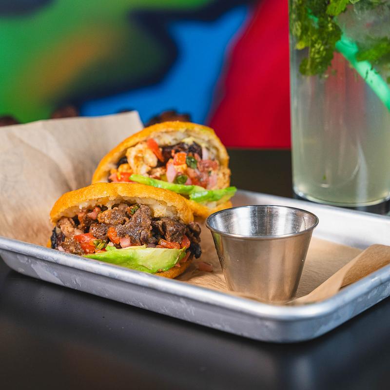 A traditional Venezuelan corn pancake-sweet slightly rustic, stuffed with a soft fresh cheese then folded like a taco, topped with sour cream & crumbled cheese | Add Pork Belly $5.00