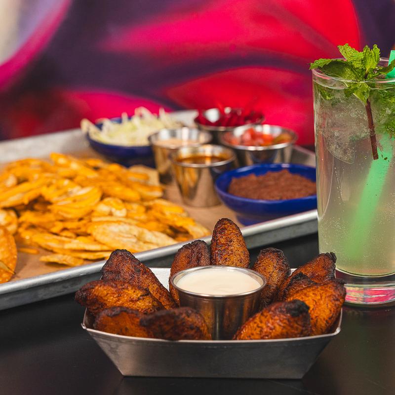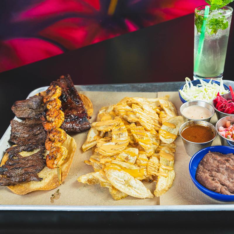 Served with refried beans, fried green banana, or french fries, house dressing, chimichurri, pico, pickled onions & jalapeños.