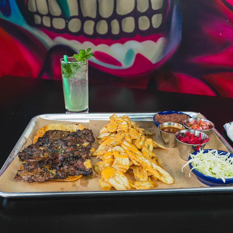 Papas fritas cubiertas con bistec a la parrilla, guacamole, pico de gallo, crema agria y queso.