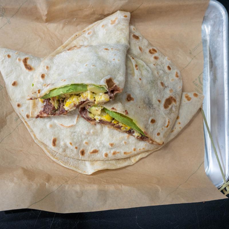 Tortilla de harina con frijoles fritos, huevos revueltos, aguacate, crema y queso. Agrega bistec o hazio vegetariano.