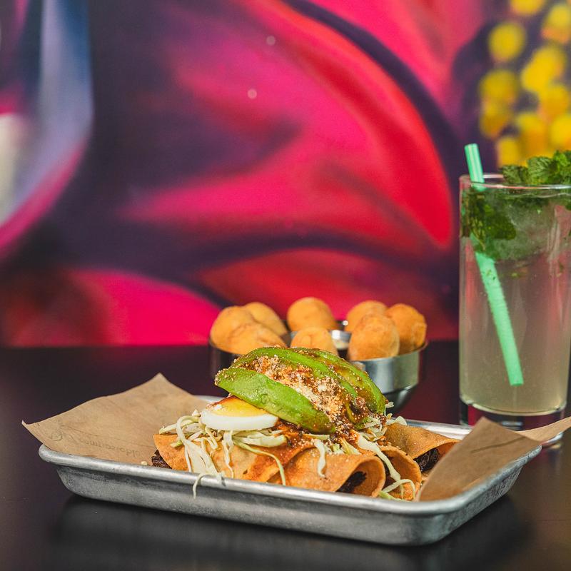 Pollo marinado dentro de tortillas de maiz enrolladas y fritas, cubiertos con ensalada Hondureña, aguacate, rebanadas de huevo, queso y un drizzle de adobo.