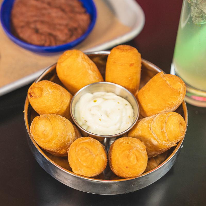 Palitos de pan Venezolanos rellenos de queso, fritos hasta quedar dorados y crujientes, servidos con salsa de ajo.