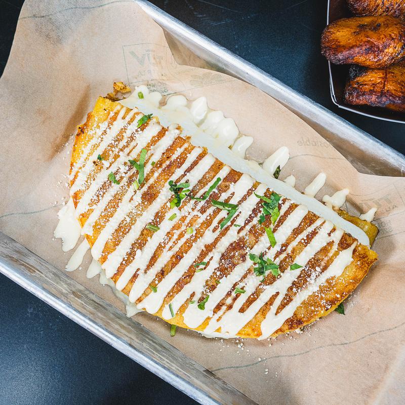 Panqueque Venezolano de maíz dulce, relleno de queso fresco suave, doblado como taco, cubierto con crema y queso rallado | Agrega Chicharrón Crujiente por un costo adicional.