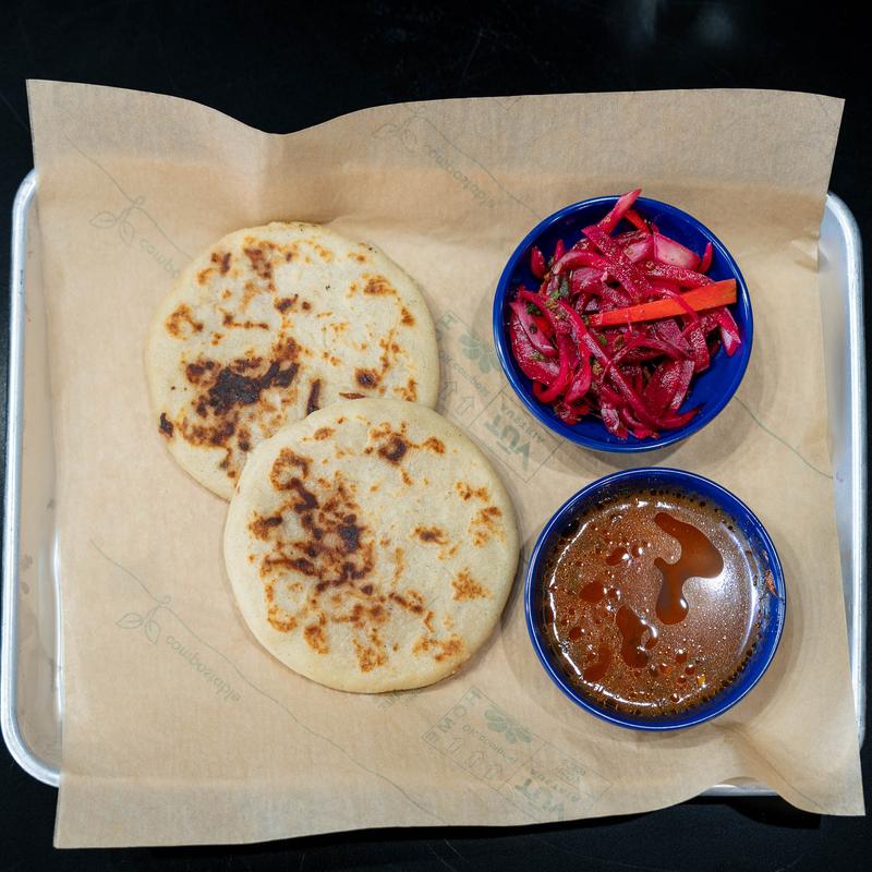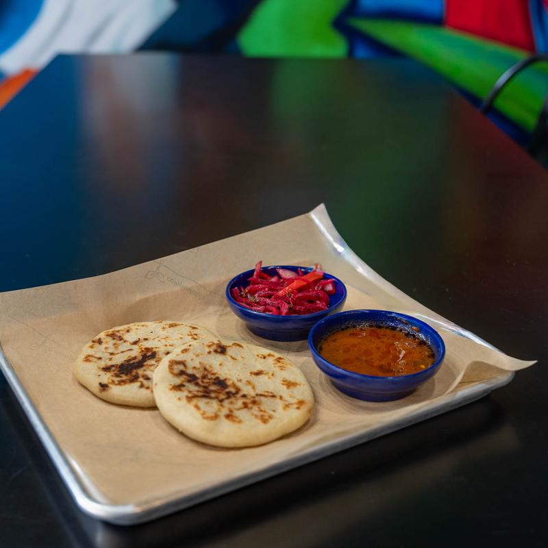 Thick hand-formed corn tortillas stuffed with choice of cheese, revueltas (beans pork, & cheese) or chicken. Served with curtido (pickled onions) and salsa roja.