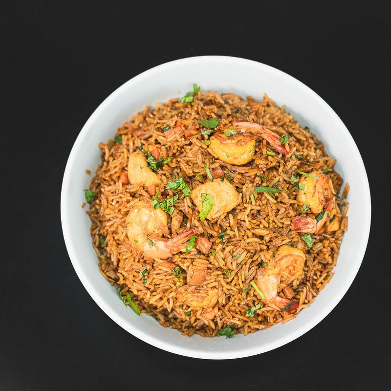 Salteado con vegetales mixtos, carne asada, pollo y camarón; sazonado con salsa de soya, especias y otros ingredientes.